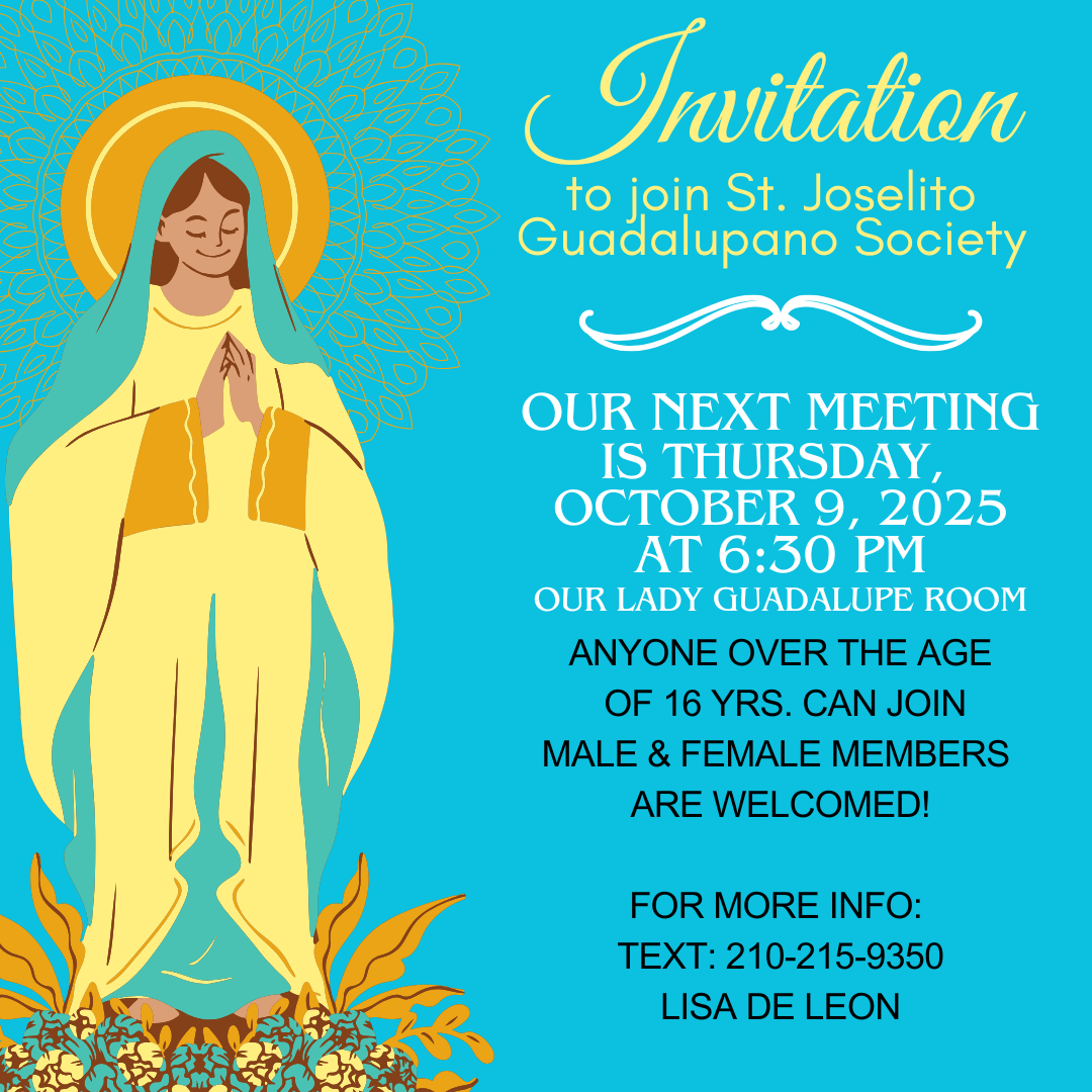 How beautiful and sacred is it to have a place to go any time of the day to be with Jesus. Adoration in the main sanctuary is now open Monday - Friday 9:00 a.m. to 1:00 p.m. Please contact Pedro Ramirez if you have any questions or concerns at (210) 497-0323.